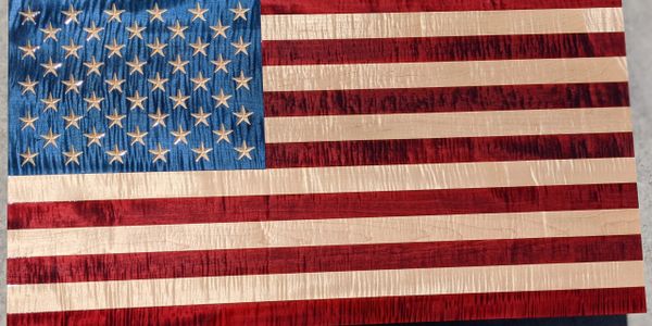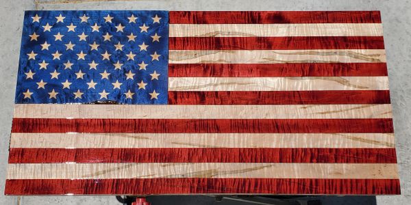 This is a beautiful example of Ambrosia-Flame Maple (unicorn wood) with stained stars. This wood is extremely hard to come buy. But when I do, I invite customers to pick out the wood they want for their flags. Every piece of wood is hand picked by me for every flag.